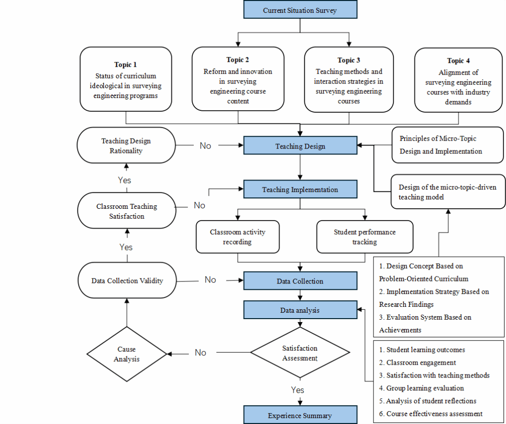 During the teaching implementation phase, instructors systematically document student engagement and classroom interactions. Learning outcomes are then evaluated through data analysis, and iterative refinements to teaching methods are made based on feedback. This cyclical optimization process enhances teaching quality and fosters improved student learning experiences. Specifically, for surveying and mapping engineering students, this structured implementation framework provides robust support for the development of practical skills and innovative problem-solving capabilities.