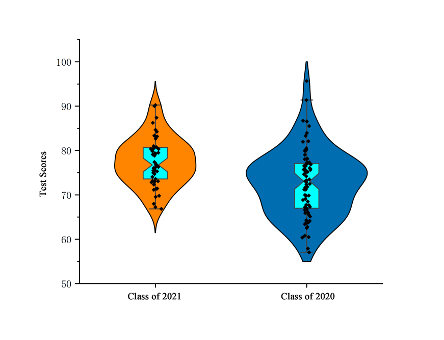 Boxplot analysis indicates that the distribution of scores among the 2021 cohort is more concentrated, with a higher median compared to the 2020 cohort. The narrower interquartile range suggests greater consistency and stability in academic performance. Additionally, violin plot analysis reveals that the middle section of the 2021 cohort’s distribution is wider, indicating a concentration of scores around the mean. In contrast, the 2020 cohort exhibits a wider distribution in the lower score range, suggesting a prevalence of lower academic performance.