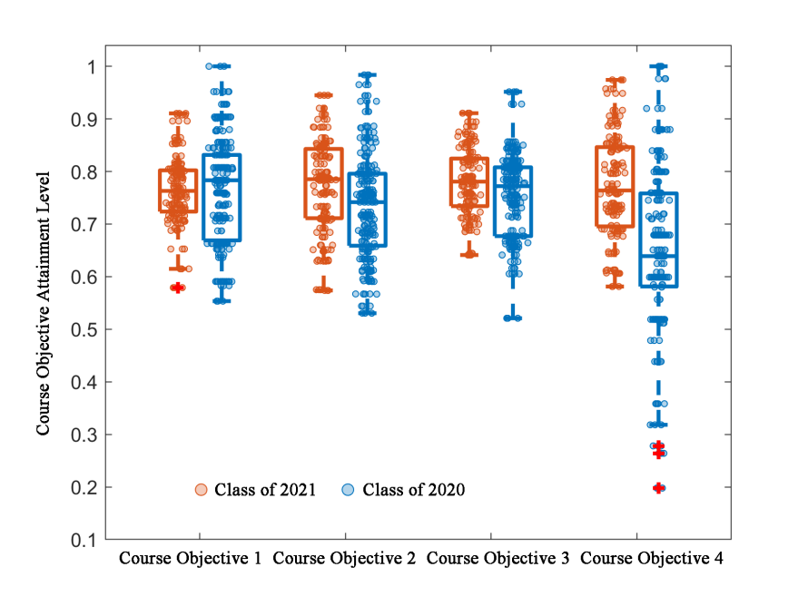 A further comparison of the achievement levels of four course objectives between the 2021 and 2020 cohorts reveals that students in the 2021 cohort demonstrated overall higher attainment across all objectives, as illustrated in Figure 4. The specific findings are as follows: