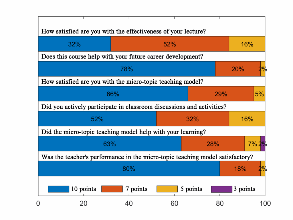 To objectively and systematically evaluate the effectiveness of the micro-topic-pedagogy teaching model, it is essential to establish a structured data analysis and assessment framework. First, quantitative data are collected through final exams and questionnaire surveys to measure students’ overall satisfaction with the micro-topic approach, their recognition of the teaching model, and their learning experience.