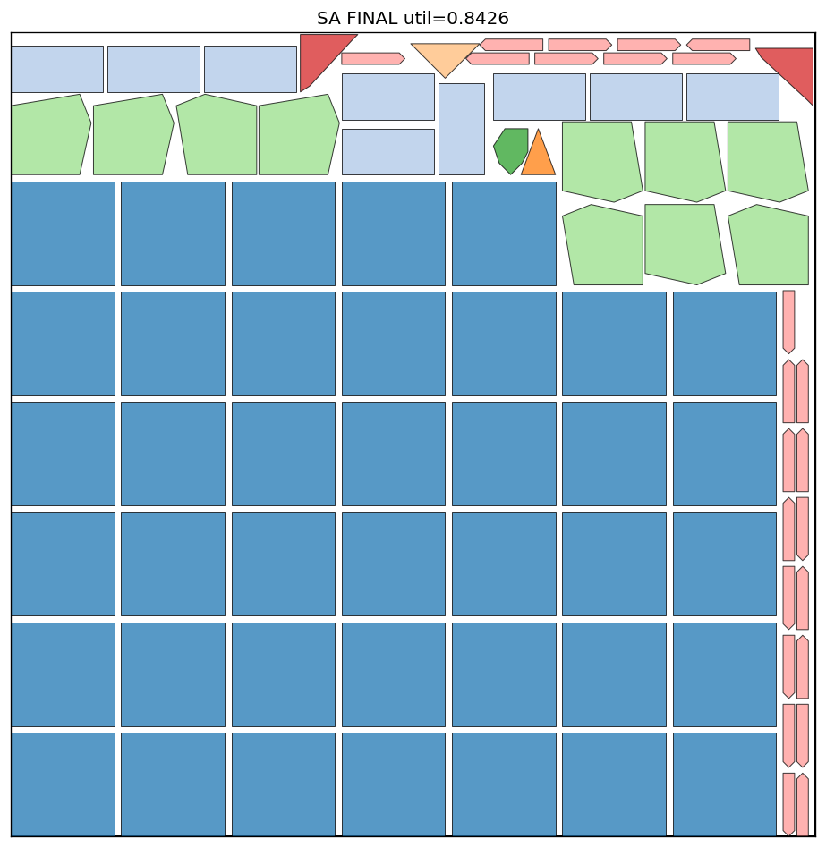 The same team later (2009) integrated Simulated Annealing (SA) into Best-Fit-type rectangular placement. Their motivation was to use temperature-controlled stochastic perturbations to escape congested suboptimal sequences; the principle was to adjust part order and orientation through SA, then apply an efficient constructive placement. The limitation was that classic SA required empirical tuning of parameters and cooling schedules, and the computational time remained high for large instances. Nevertheless, this hybrid line of research directly influenced many subsequent industrial systems that combine a metaheuristic outer loop with a fast constructive placement kernel [6]. Rather than optimizing sequences than decoding, we evolve layouts in place, so each perturbation has immediate geometric meaning without a separate decoding stage.