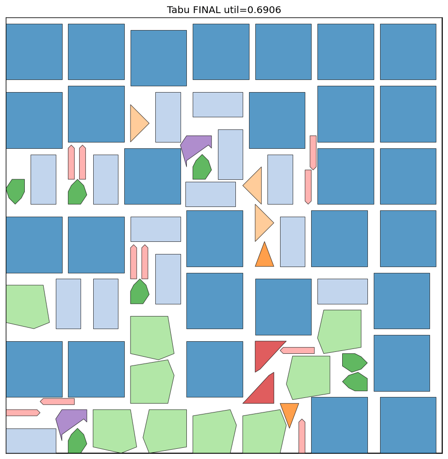 In the “strong local improvement” direction, [10] applied Tabu Search (TS) to two-dimensional non-guillotine cutting. The motivation was to exploit TS’s memory mechanism to prevent cycling around similar sequences or orientations. The principle involves iterative neighborhood operations (swaps, rotations) combined with a tabu list and refined feasibility checks. The weakness is that performance depends heavily on neighborhood design and weight parameters, and geometric evaluation can be computationally expensive per step. We avoid expensive neighborhood evaluations on a decoder by making feasibility checks cheap and local (bounding boxes or SAT), which keeps per-step cost predictable under continuous rotation.