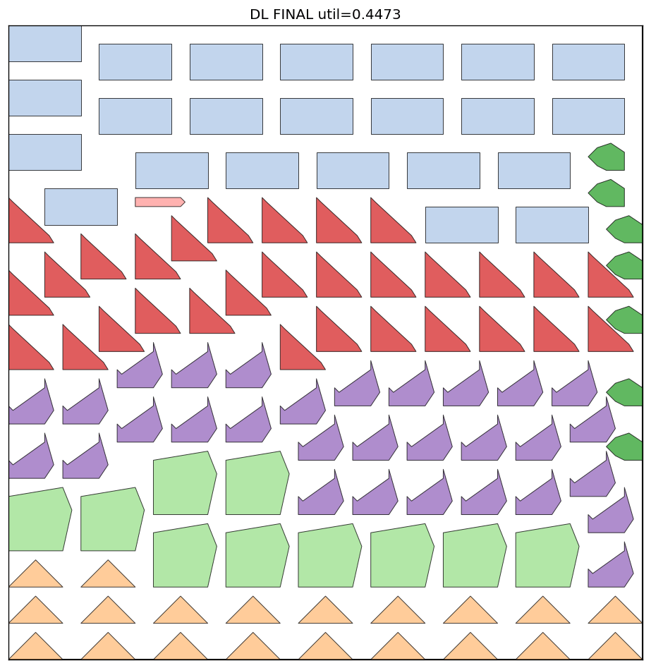 In 2006, [4] brought the BL approach to its highest level. Their motivation was to evolve BL from a “fast but coarse” heuristic into an algorithm capable of handling curved edges and holes, while outperforming previous methods on industrial benchmarks. The core principle remained a constructive bottom-left-fill, but with more efficient geometric state management and robust collision detection, allowing it to function under diverse geometric representations. The limitation, however, was intrinsic: no matter how strong a constructive heuristic is, it remains sequence-dependent, and for ultra-dense or large-scale rearrangements, solution quality still lags behind powerful combinatorial or hybrid metaheuristic methods. Because constructive kernels remain sequence-bound, we operate directly in layout space and treat rotation as a first-class, continuous variable, reducing reliance on sequence heuristics during early exploration.