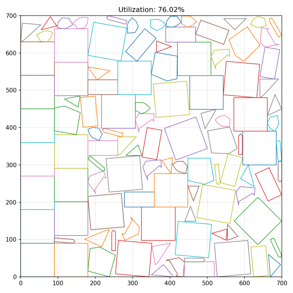 Finally, and most fundamentally, our work reframes a traditionally optimality-driven problem as an engineering adaptivity problem. We explicitly accept a strategy of “near optimal yet stable, fast, and visual,” treating randomness and approximation as integral design choices, not defects. While this stance may appear less rigorous academically, it is highly innovative from a systems-engineering point of view. Real-world nesting rarely has a single objective; it balances time, material, visibility, safety margins, and machining order, among others. Our architecture embraces these heterogeneous conditions within an open probing framework, transforming nesting from a closed mathematical optimization exercise into a continually evolvable engineering simulation system. In summary, innovation is not a single technical breakthrough, but a paradigm shifts bridging theory and practice. It redefines both the problem space and the solving logic: from explicit geometric boundaries to statistical feasibility, from strict genotype design to behavioral evolution, from fixed angle discretization to continuous random exploration, and from closed algorithms to collaborative simulation platforms. Together, these layers form a “stochastic–approximate–operable” nesting mindset whose value lies not in squeezing out the highest possible utilization, but in achieving the most flexible solution architecture at the lowest cost. If coupled later with a traditional geometric core—such as semi-discrete BLF [13] or Beam Search [9]—the system can combine speed with high density, serving as a bridge between theoretical methods and industrial engineering.
