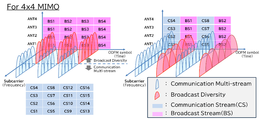 Based on these qualitative considerations, it can be concluded that TDM is advantageous as a MIMO multiplexing method for both IP broadcasting and communication streams. More advanced multiplexing schemes that maximize the MIMO effect might be possible for further study.