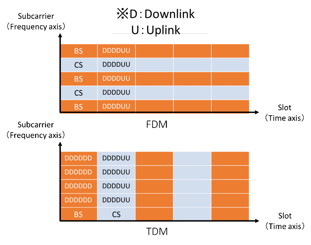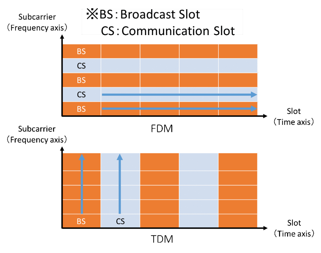 As illustrated in Figure 5-1, FDM distributes broadcasting resource blocks in the slot direction (time axis), while TDM concentrates them in the subcarrier direction. Consequently, TDM offers reduced packet transmission delay, rendering it more advantageous in this aspect.