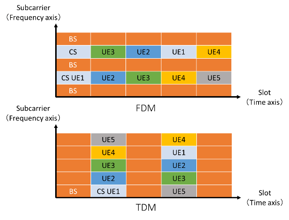 Figure 5-2 demonstrates that in FDM, resource blocks allocated for communication to each User Equipment (UE) are distributed in the slot direction. This necessitates received power prediction when scheduling UEs based on received power, potentially reducing scheduling accuracy. Conversely, TDM concentrates communication resource blocks in the subcarrier direction, allowing for more accurate distribution of resource blocks to receiving terminals based on received power.