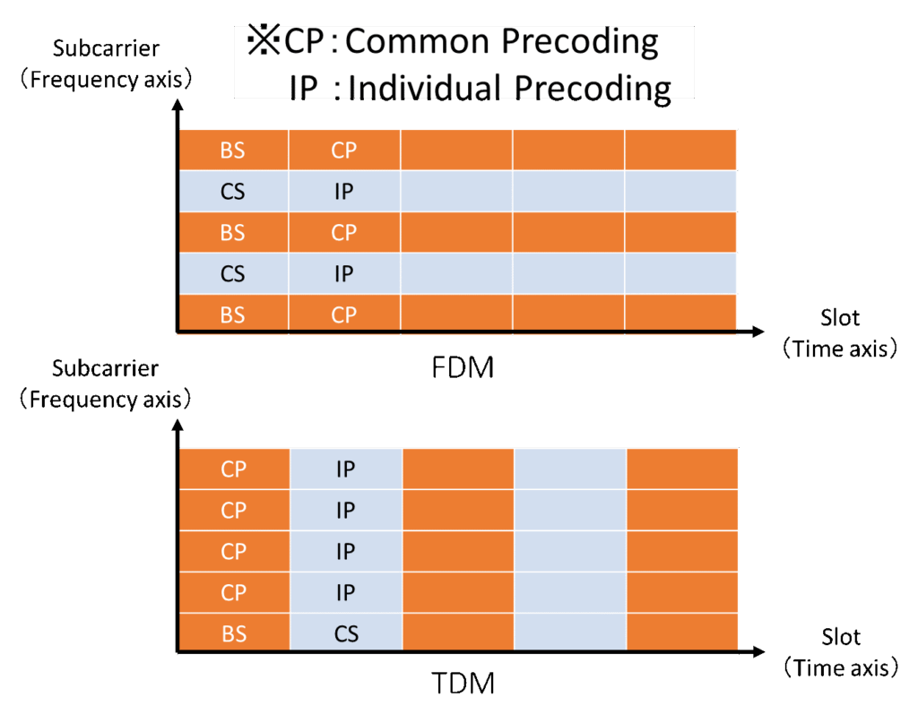 Figure 5-4 illustrates that FDM necessitates the simultaneous application of two types of MIMO precoding (for broadcasting and communication) to each terminal for each slot. In contrast, TDM requires only one type of precoding (either broadcasting or communication) per slot time for each receiving terminal, potentially reducing the implementation load, particularly on the receiving terminal.
