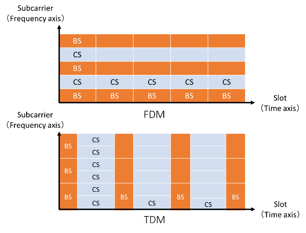 If it is necessary to change the 30kHz and 60kHz subcarrier spacing specified in the 100MHz band of the sub-6 band for broadcasting and communication or synchronization control, in FDM, the subcarrier spacing cannot be changed by the frequency as shown in Figure 5-5 due to frequency interference, and TDM with variable subcarrier intervals is advantageous.