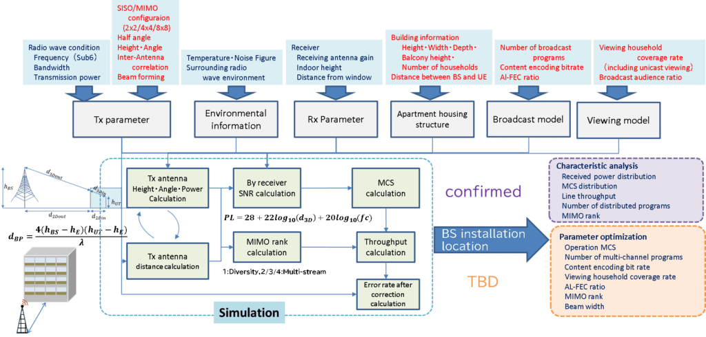 The broadcasting model incorporates parameters such as the number of IP broadcast programs, content coding bit rate, and the error correction coding rate (AL-FEC: Application Layer Forward Error Correction) applied in FLUTE encapsulation following MPEG-DASH. The viewing model allows for time-varying settings of household viewing rates and IP broadcast viewing rates. The simulator outputs include received power distribution, MCS distribution, transmission throughput, BLER distribution, MIMO rank distribution, and the number of IP broadcast-ready programs for each household in the complex.